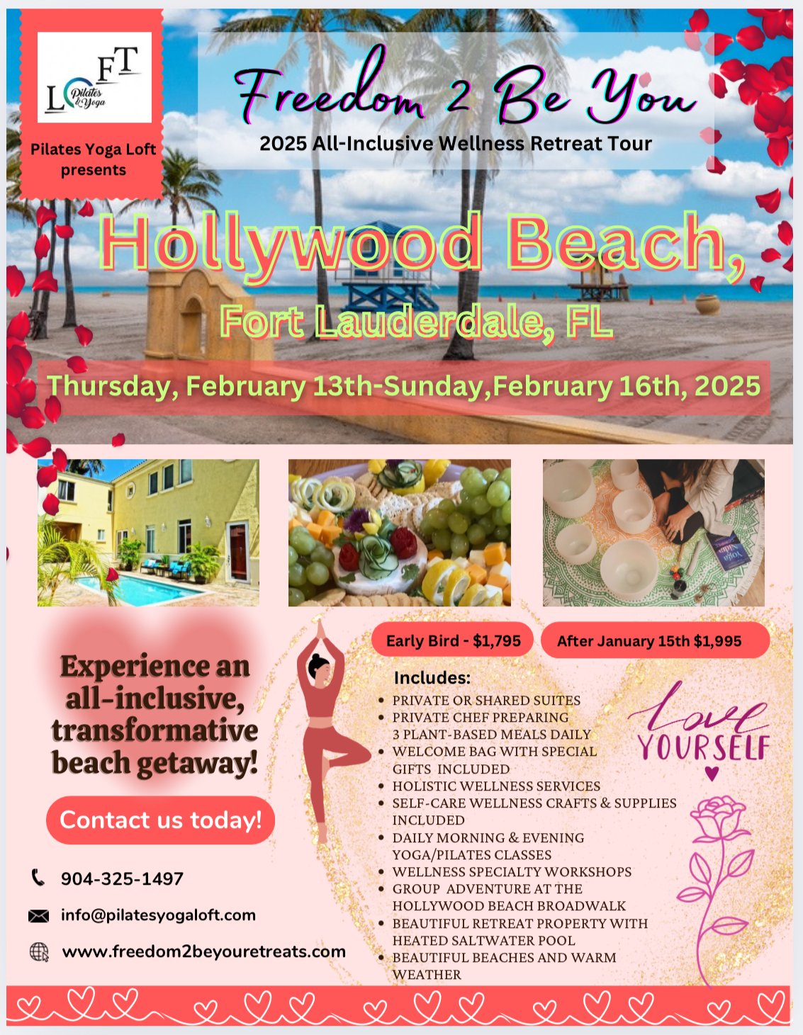 It all begins with an idea. How do we experience the world with new eyes and opportunities. How do we find balance and healing for our mind, body, and spirit. Freedom 2 Be You retreats will guide you to new heights, allowing you more freedom to heal the mind, body, and spirit. Join us for this beautiful retreat in Hollywood Beach & Fort Lauderdale, FL. Come escape the cold dark winter months with sunshine and fun. Our beautiful South Florida retreat property has a heated salt water pool, and is steps away from the popular Hollywood Beach Broadwalk. Experience amazing food, culture, holistic wellness, and stunning turquoise waters that will leave you feeling refreshed and renewed. Our wellness team is excited to welcome you for this retreat that you’ll remember for a lifetime.
